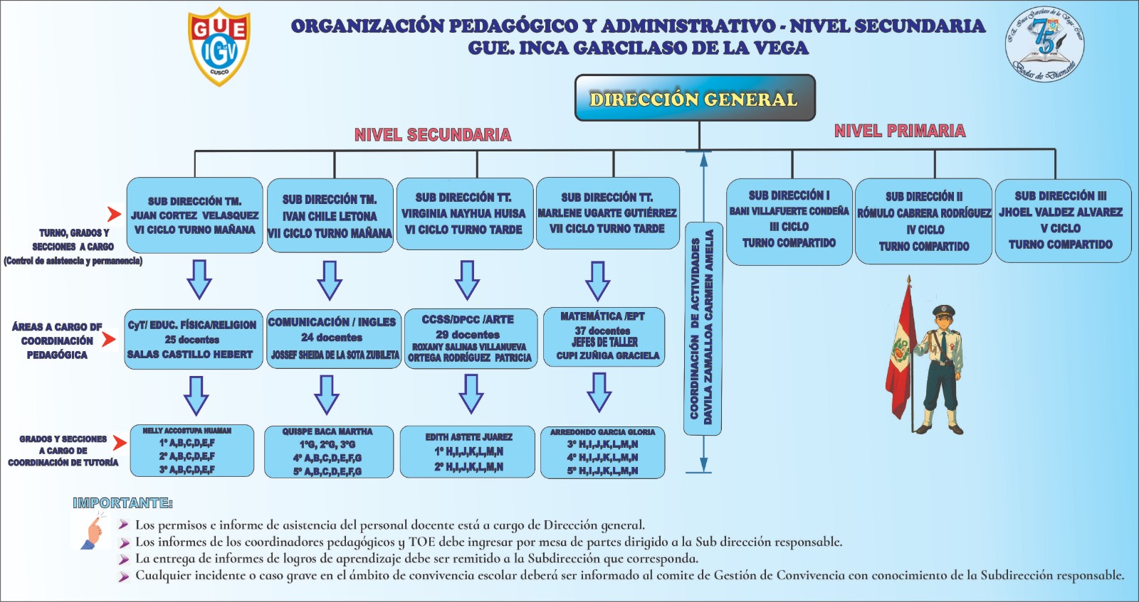 Señores exalumnos, exdirectivos, exdocentes, exadministrativos y garcilasianistas en general, tienen la alta responsabilidad de concurrir a este evento magno y significativo que desarrollará muchas actividades con este motivo.